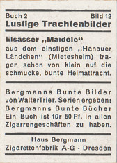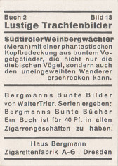 A set of cartoons from Walter Trier. The cards were referred to as "Bergmanns Bunte Bilder" (Bergmann's colourful pictures) whereas the albums were "Bergmanns Bunte Bücher" (Bergmann's colourful books). Some cards were issued in pairs which could be separated before fixing them in the album.