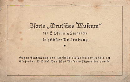 The card advertizes Isaria "Deutsches Museum" cigarettes. As the Deutsches Museum in Munich is built on an island in the river Isar it is possible that these cigarettes were produced by the museum. Anyone sending in 100 cards got 25 cigarettes free. The picture shows the museum as it was in the late 1920s before the library was built, possibly indicating the approximate date of issue.