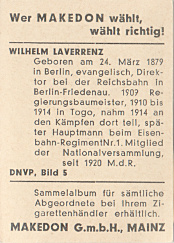 The set shows members of the German parliament (Reichstag). The set is divided into groups corresponding to the parties represented in the parliament. There is no overall numbering, so it is not certain how many cards there are in the set. Köberich gives the total as 96. Cards seen are: