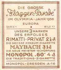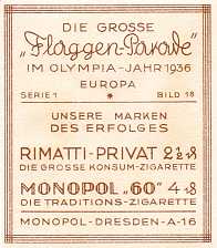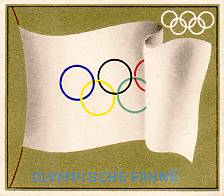 This set illustrates flags of the world. In general the national flags have the olympic hoops in the corner whereas the other flags of the country don't. The olympic flag itself exists in both versions. Monopol seem to have had the philosophy that nice cards can be produced just by making them big and giving them a gold background. I find the Aurelia flags much more attractive. |