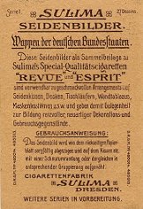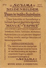 These silk pictures were issued attached to pieces of card. They were intended to be removed to be sewn onto cushion covers etc. Some cards give the number on the back in the top left corner. Others mention only "Serie 1". In this case the card number is in the top left corner on the front.