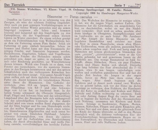 Spring binders were produced which could hold around 100 pictures. Four binders were thus necessary for the complete collection. Although the cards have some sort of numbering on the back, this appears to be more related to where the animals illustrated fit in with some taxonomy rather that to the position within a set. The following is the official list of cards as provided by Voss.