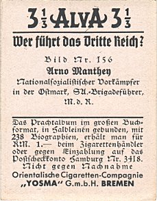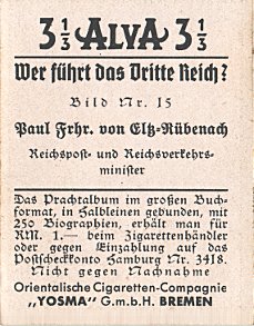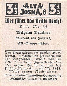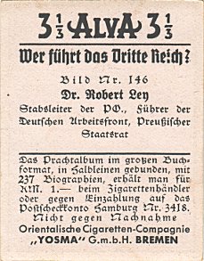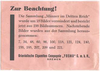 This set shows the leaders of the Third Reich. Initially a set of 250 cards, it was reduced to 238 after the "night of the long knives" and subsequently to 237. After this the set was reissued as "Männer im dritten Reich" (men in the third reich) with 236 cards which was then reduced to 235.